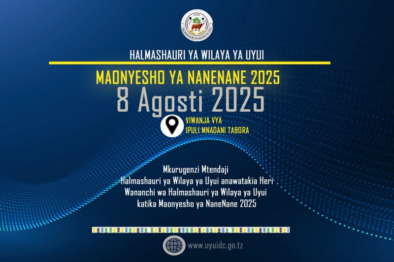 Mkurugenzi Mtendaji wa Halmashauri ya Wilaya ya Uyui Bi Leokadia G. Humera anawatakia Wananchi na Watumishi wote wa Halmashauri ya Wilaya ya Uyui Maonyesho ya NaneNane yenye Amani na Utulivu . Maonyesho haya Kimkoa yanafanyika katika Viwanja vya Ipuli Mnadani Tabora Tarehe 8/8/2025.