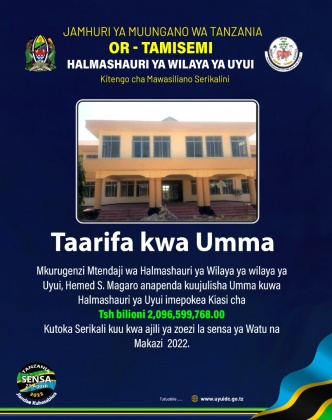Mkurugenzi wa Halmashauri ya Wilaya Uyui anapenda kuujulisha Umma kuwa Halmashauri ya Wilaya Uyui imepokea kiasi cha Tsh bilioni 2,096,599,768.00 kutoka Serikali kuu kwa ajili ya zoezi la sensa ya watu na makazi mwaka 2022.